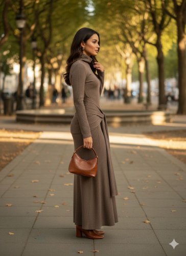 • Kadın uzun kollubalıkçı yaka bürümcük kumaş kuşak dahilkalem elbise